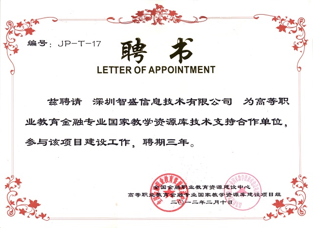 【金融資源庫項(xiàng)目組頒發(fā)給深圳市智盛信息技術(shù)有限公司的聘書】