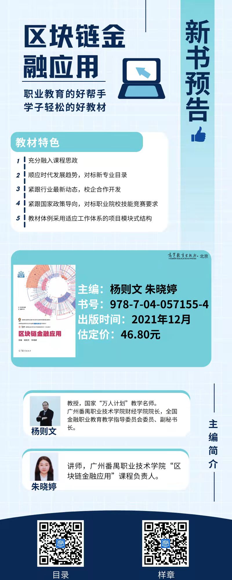 本教材是由國家“萬人計劃”教學(xué)名師楊則文教授帶隊、校企合作編寫的項目式立體化教材《區(qū)塊鏈金融應(yīng)用》。由高等教育出版社出版發(fā)行,是高等職業(yè)教育財經(jīng)類專業(yè)群數(shù)智化財經(jīng)系列教材;也是高等職業(yè)教育金融類專業(yè)“崗課賽訓(xùn)”融通系列教材,并將于近期上市發(fā)行。