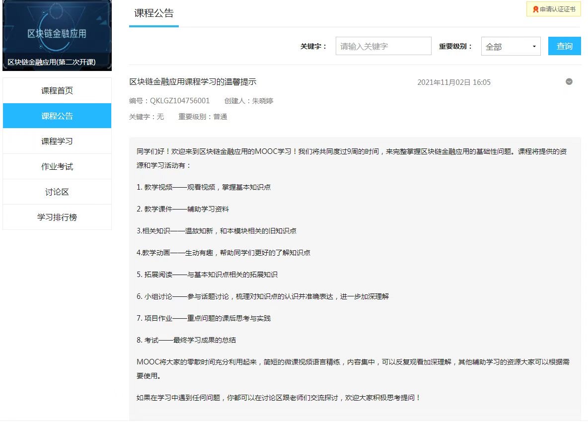為落實中央部署,教育部于2020年4月30日發(fā)布《高等學(xué)校區(qū)塊鏈技術(shù)創(chuàng)新行動計劃》(以下簡稱《行動計劃》),文件要求“到2025年,在高校布局建設(shè)一批區(qū)塊鏈技術(shù)創(chuàng)新基地,培養(yǎng)匯聚一批區(qū)塊鏈技術(shù)攻關(guān)團隊,基本形成全面推進、重點布局、特色發(fā)展的總體格局和高水平創(chuàng)新人才不斷涌現(xiàn)。高質(zhì)量科技成果持續(xù)產(chǎn)生的良好態(tài)勢,推動若干高校成為我國區(qū)塊鏈技術(shù)創(chuàng)新的重要陣地,一大批高校區(qū)塊鏈技術(shù)成果為產(chǎn)業(yè)發(fā)展提供動能,有力支撐我國區(qū)塊鏈技術(shù)的發(fā)展、應(yīng)用和管理。文件同時提出“針對區(qū)塊鏈在金融服務(wù)領(lǐng)域應(yīng)用的需求和問題,建設(shè)基于區(qū)塊鏈的金融服務(wù)技術(shù)與應(yīng)用創(chuàng)新平臺,支撐開展區(qū)塊鏈在數(shù)字貨幣、跨境支付/結(jié)算、供應(yīng)鏈金融、資產(chǎn)證券化等金融業(yè)務(wù)的創(chuàng)新應(yīng)用研究;支撐開展面向金融監(jiān)管領(lǐng)域需求的區(qū)塊鏈關(guān)鍵技術(shù)應(yīng)用研究,提升我國防范和化解金融風(fēng)險的能力,助力國家金融安全,提升我國的金融科技創(chuàng)新能力和應(yīng)用水平,推動我國數(shù)字金融發(fā)展和人民幣國際化",這一系列講話和文件明確了學(xué)校開展區(qū)塊鏈技術(shù)應(yīng)用研究和開設(shè)區(qū)塊鏈技術(shù)課程的重要性和必要性,為區(qū)塊鏈金融應(yīng)用進入課堂提供了強大的政策推動力。