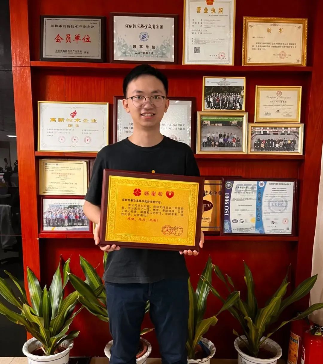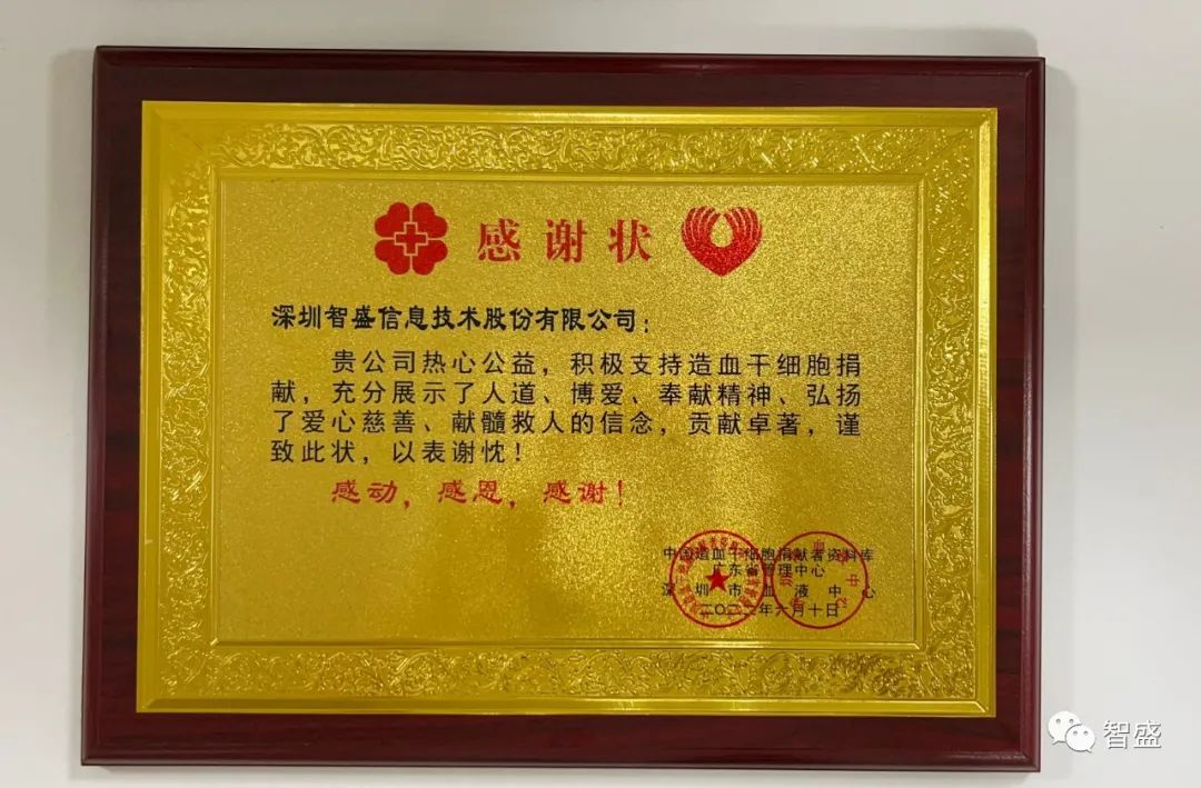 當日,深圳市血液中心為韋宗杰和深圳智盛信息技術股份有限公司頒發(fā)了榮譽證書和感謝狀。