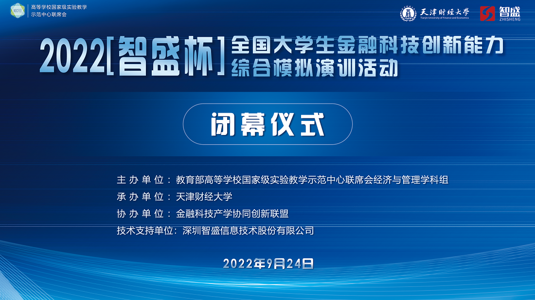 2022年9月18日,由教育部高等學(xué)校國(guó)家級(jí)實(shí)驗(yàn)教學(xué)示范中心聯(lián)席會(huì)經(jīng)濟(jì)與管理學(xué)科組主辦;天津財(cái)經(jīng)大學(xué)承辦;金融科技產(chǎn)學(xué)協(xié)同創(chuàng)新聯(lián)盟協(xié)辦;深圳智盛信息技術(shù)股份有限公司作為技術(shù)支持的2022 年“智盛杯”全國(guó)大學(xué)生金融科技創(chuàng)新能力綜合模擬演訓(xùn)活動(dòng)常規(guī)賽道全國(guó)總決賽正式收官。共有來(lái)自全國(guó)64所本科院校,64支參賽隊(duì)伍共256名選手參與角逐!